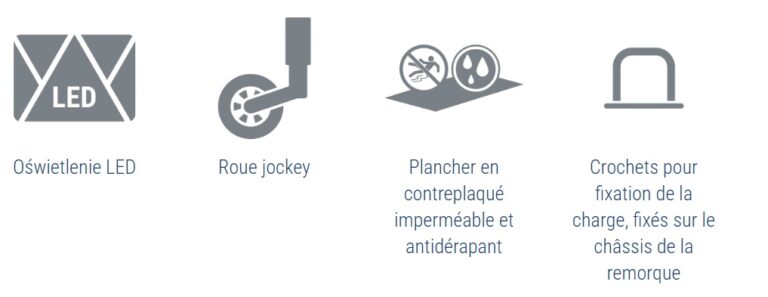 - chargement et déchargement faciles : la surface de chargement plane et la plate-forme surbaissée de la remorque facilitent l’insertion ou le chargement de la cargaison et son déchargement ultérieur ;